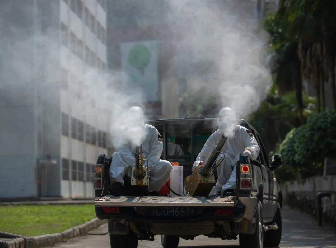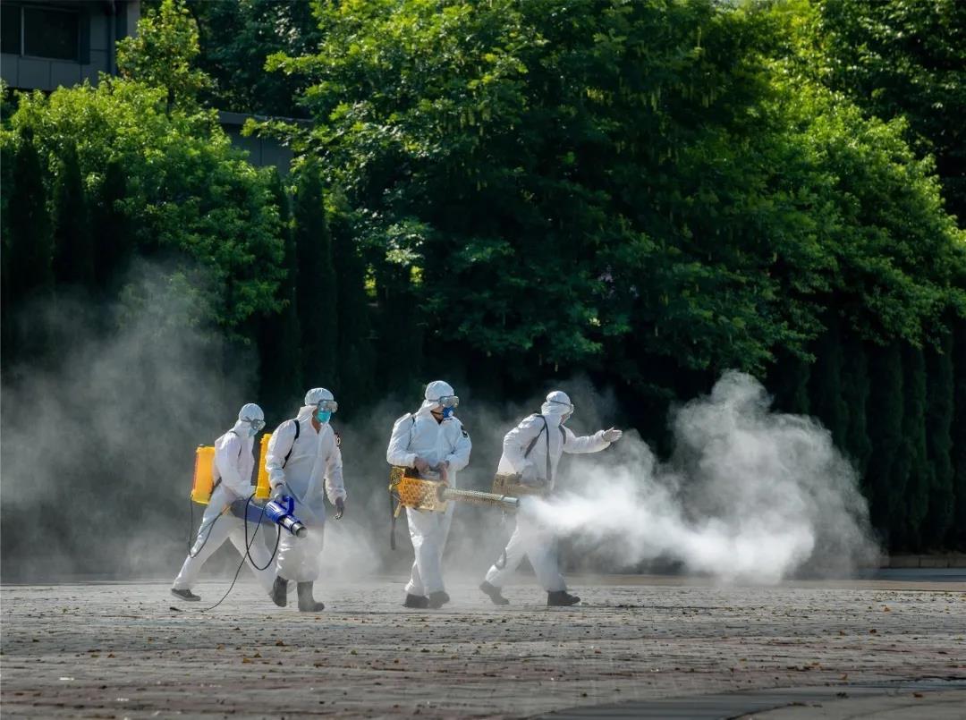 上午8点,市红十字会救援队的近十名工作人员驱车带着消毒装备来到学校,经过近半小时准备,他们穿着严密的防护服,肩负几十多斤的喷雾器,对南北校区教学楼、餐厅、体育场、学生公寓等公共场所逐一进行消毒防疫,并重点对楼道、教室、厕所等关键区域实施密集消毒,绝不留下任何一个卫生死角,全力守护师生们的健康。