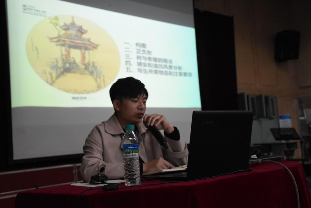 此次讲座以五大点“构图、正负形、树与老屋的画法、靖安和流坑的风景分析、写生所需物品和注意事项”展开讲解。郭晶老师带入名人画、自创画来穿插其中讲解写生知识,让同学们通俗易懂,一点就会。他鼓励同学们以更新颖的艺术理念进行艺术创作,以更鲜活的艺术笔触来描绘和展现新景新貌。他最后对我们重重嘱托,写生期间安全为先。讲座结束同学们响起阵阵掌声来表示认可和感谢郭晶老师的写生讲座指导。