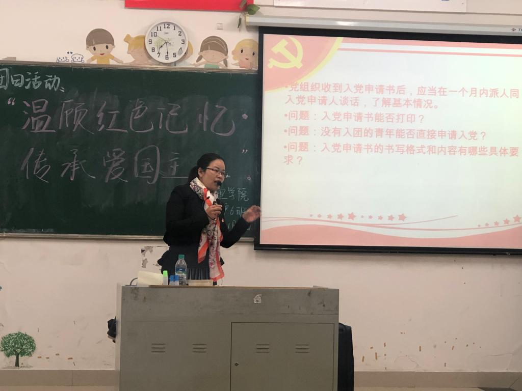 本站讯(教学第三党支部 邓小珍)11月17日晚,教学第三党支部书记邓小珍在南校区四教学楼308教室为所联系的班级护理学院20306班同学上了一堂《入党启蒙教育》党课,支部18名党员参加。