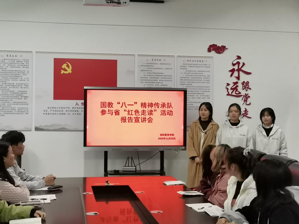 本站讯(国际教育学院 杨琨 学生记者 卢意阳)为了深入学习贯彻习近平新时代中国特色社会主义思想,弘扬红色文化,传承“八一”精神,国际教育学院于11月24日下午在科技综合楼401党员活动室开展“八一”精神宣讲会活动,此次活动由我院荣获全省高校“红色走读”竞赛活动优秀团队的三位英语教育180502班的同学负责宣讲,宣讲对象为我院入党积极分子以及2020级新生班同学代表。