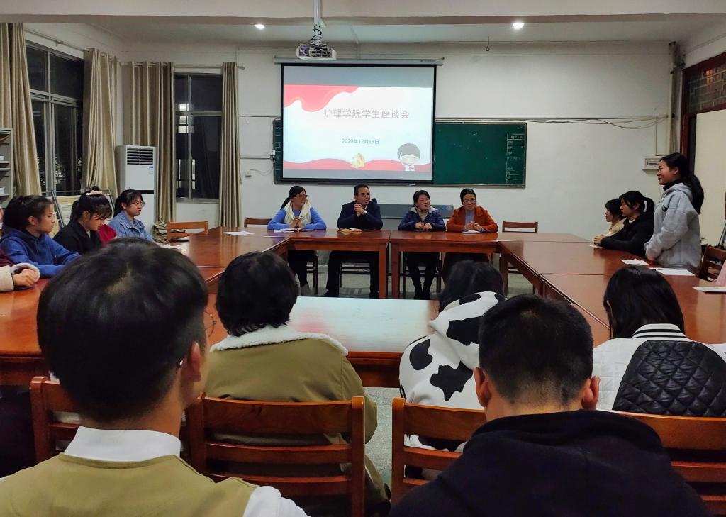 本站讯 (护理学院 王玮 李珊 学生记者 龙歆瑶)12月13日晚,“凝聚青春力量,勇担时代重任”护理学院学生座谈会在五教楼阅览室召开。护理学院党总支书记胡蓉,副院长张蔺珊、副书记王玮,学工科科长曲晴出席会议,各班学生代表、部分少数民族学生代表参加会议。