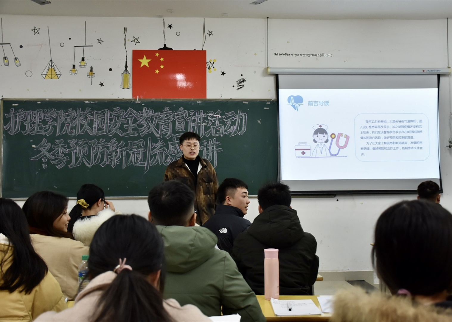 当晚7点,由44名入党积极分子组成的宣讲队来到各个班级,用自己所学习的专业知识向同学们讲解了如何预防新型冠状病毒、强调外出保持安全的社交距离、口罩的正确佩戴方法、如何正确的洗手和消杀方法及冬季流行性传染病的预防知识。提醒同学们当前疫情尚未过去,任何人都不能放松警惕。同时,入党积极分子们用真挚的情感和朴实的语言,为大家深情讲述了一些抗疫英雄的感人事迹。