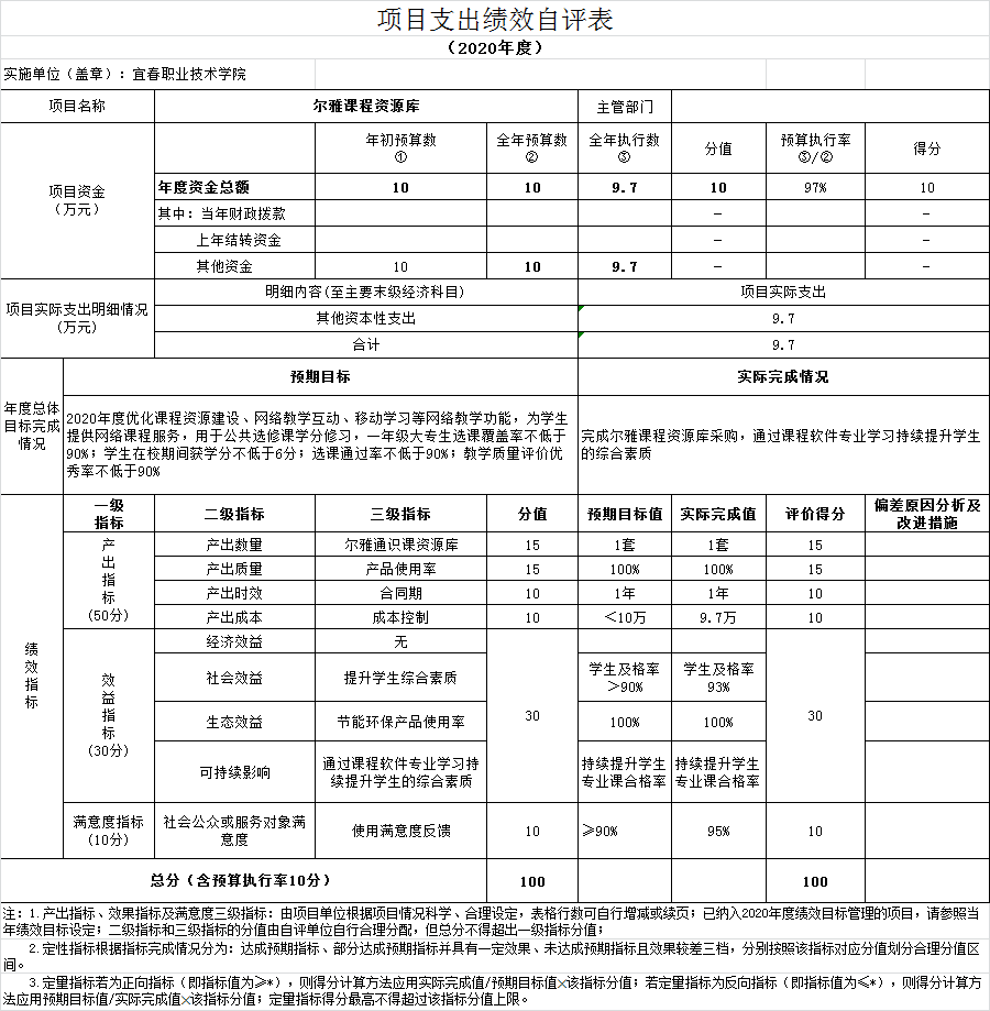项目绩效自评总体综述:根据年初设定的绩效目标,“尔雅课程资源库”项目绩效自评得分为100分。项目全年预算数为10万元,详见附表。