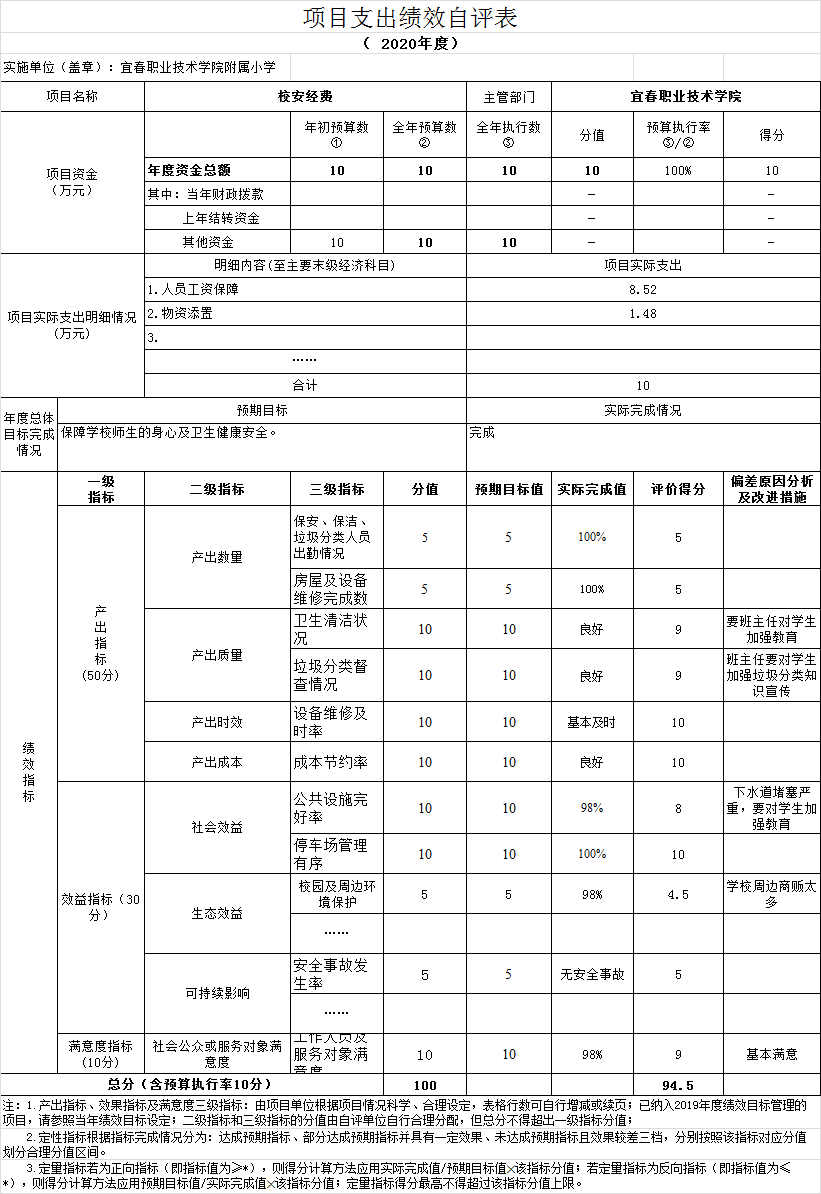 项目绩效自评总体综述:根据年初设定的绩效目标,“kaiyun开云官方网站附属小学校安经费”项目绩效自评得分为94.5分。项目全年预算数为10万元,详见附表。