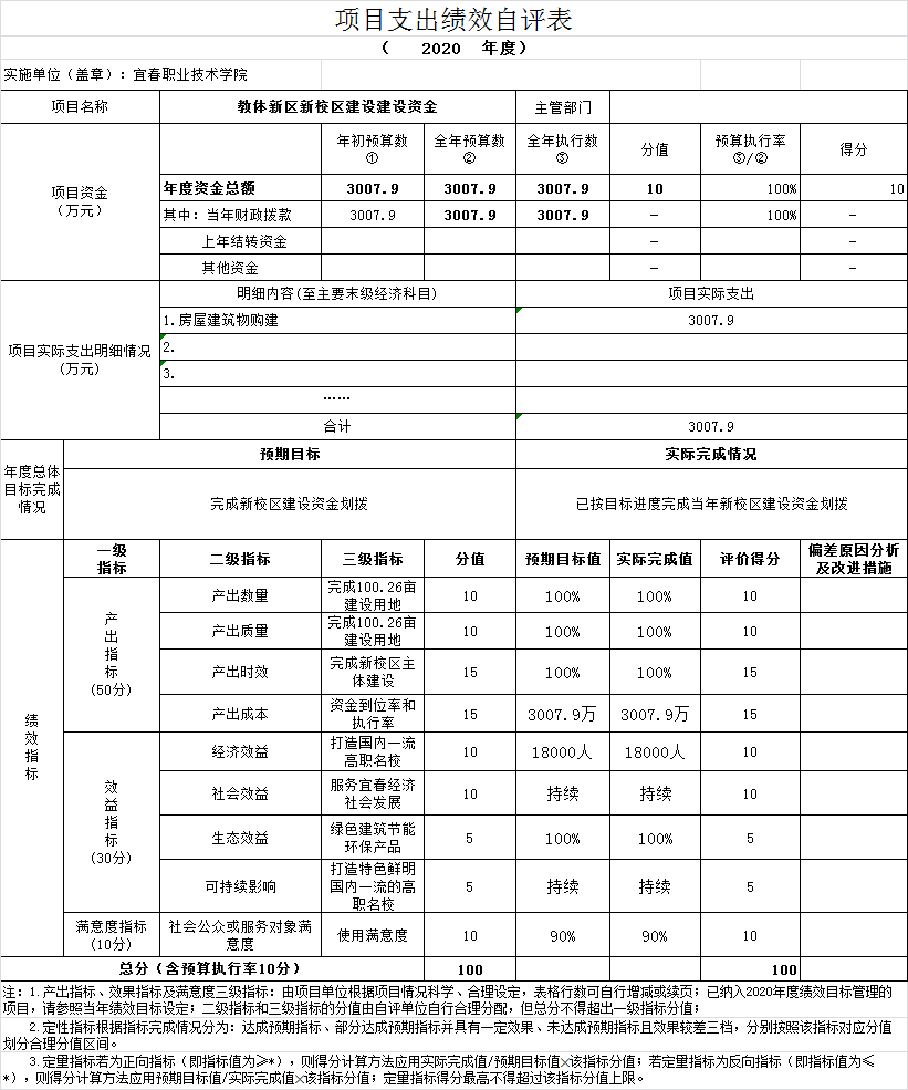 项目绩效自评总体综述:根据年初设定的绩效目标,“教体新区新校区建设建设资金”项目绩效自评得分为100分。项目全年预算数为3007.9万元,详见附表。