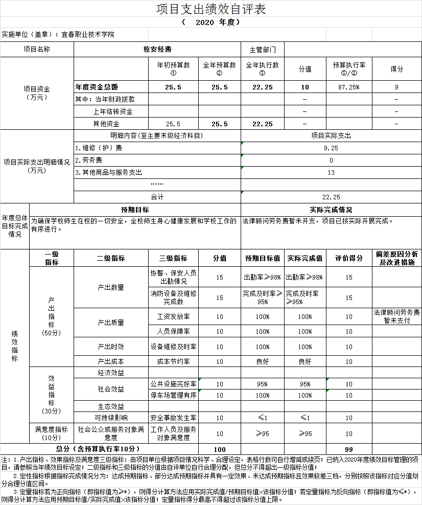 项目绩效自评总体综述:根据年初设定的绩效目标,“校安经费”项目绩效自评得分为99分。项目全年预算数为25.5万元,执行数为22.25万元,详见附表。