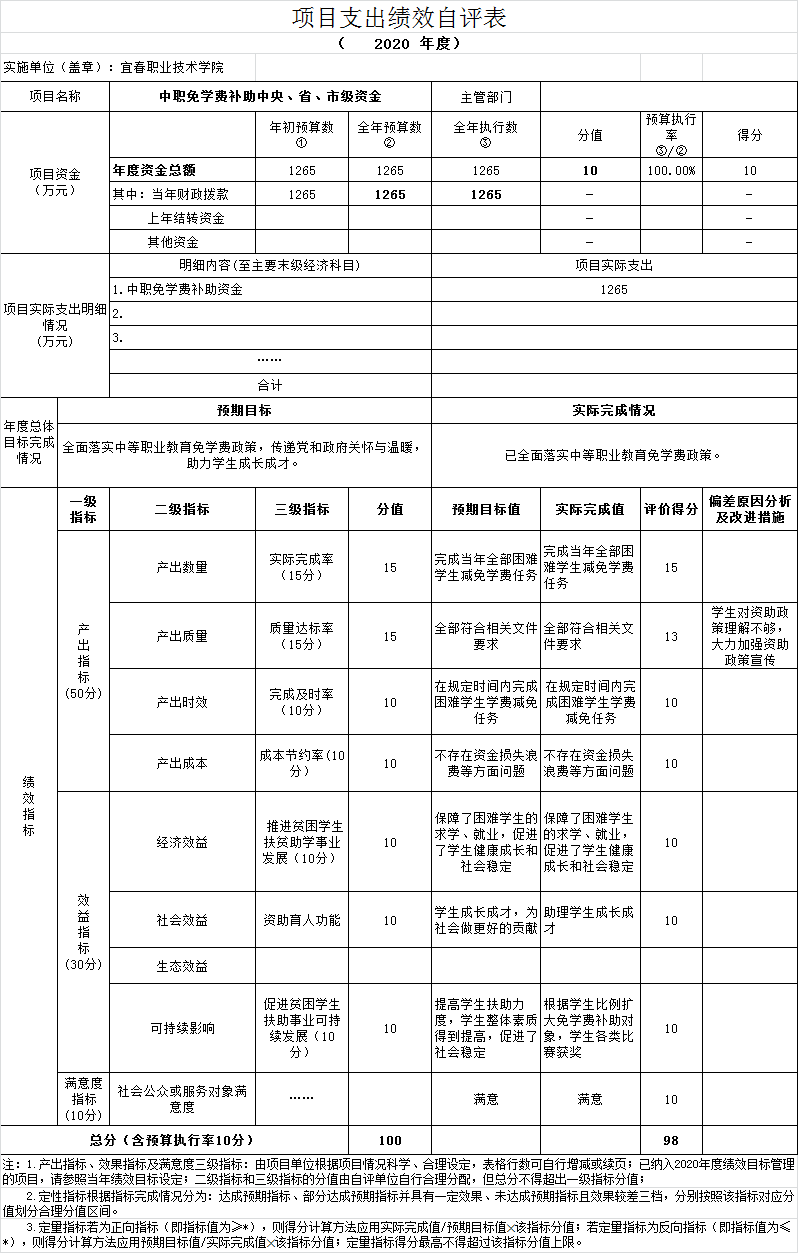 项目绩效自评总体综述:根据年初设定的绩效目标,“中职免学费补助中央、省、市级资金”项目绩效自评得分为98分。项目全年预算数为1265万元,详见附表。