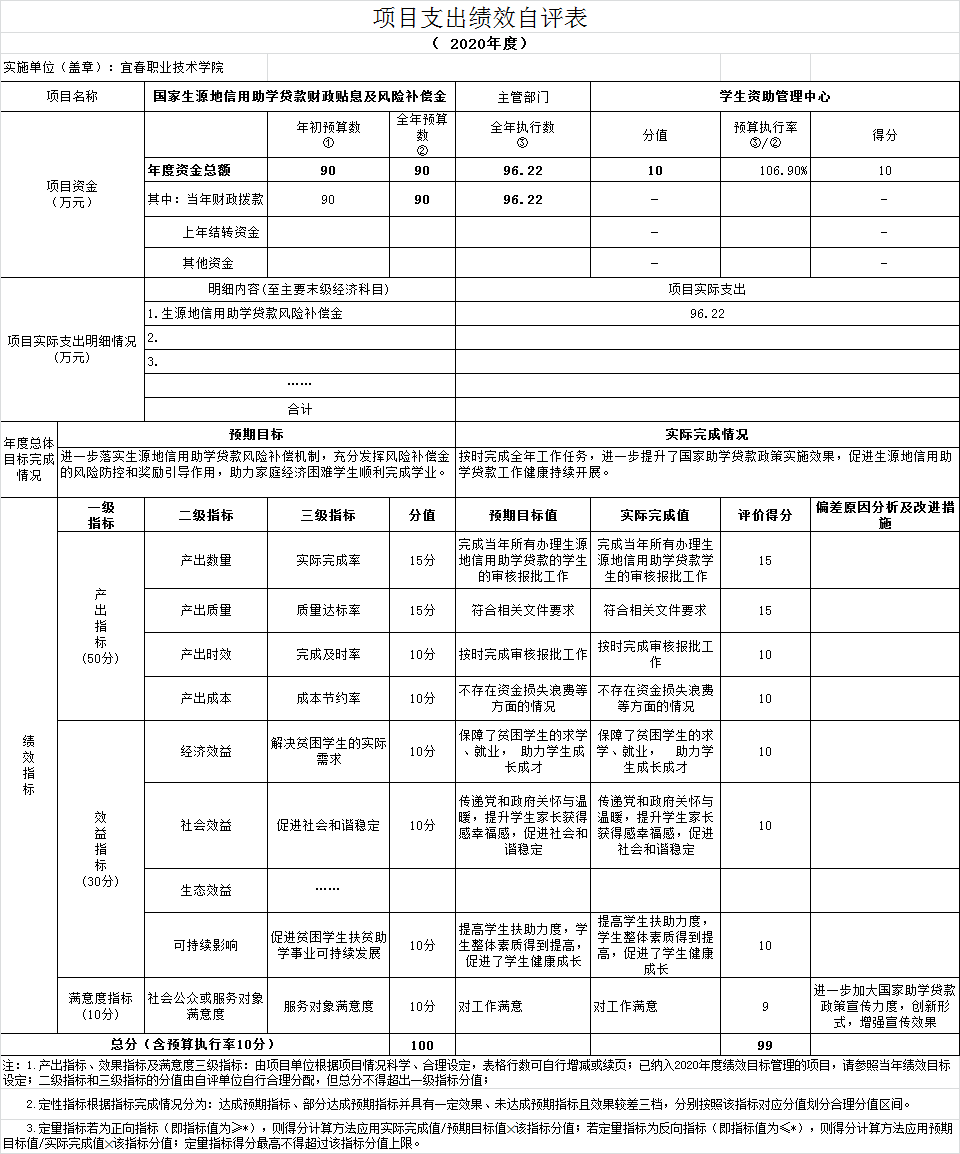 项目绩效自评总体综述:根据年初设定的绩效目标,“国家生源地信用助学贷款财政贴息及风险补偿金”项目绩效自评得分为99分。项目全年预算数为90万元,详见附表。