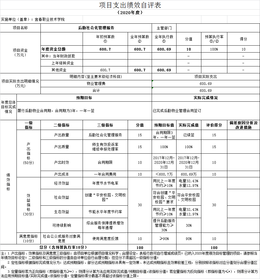 项目绩效自评总体综述:根据年初设定的绩效目标,“后勤社会化管理服务”项目绩效自评得分为100分。项目全年预算数为600.7万元,详见附表。
