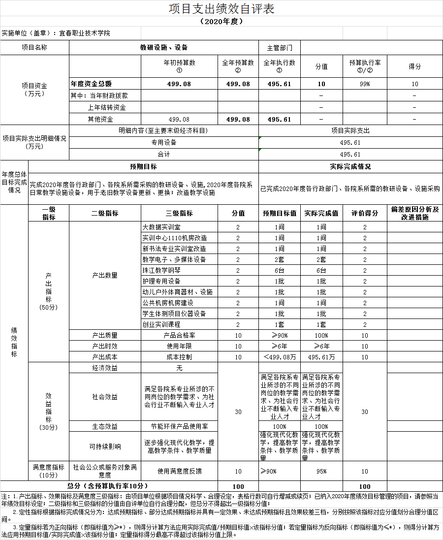 项目绩效自评总体综述:根据年初设定的绩效目标,“教研设施、设备”项目绩效自评得分为100分。项目全年预算数为499.08万元,详见附表。