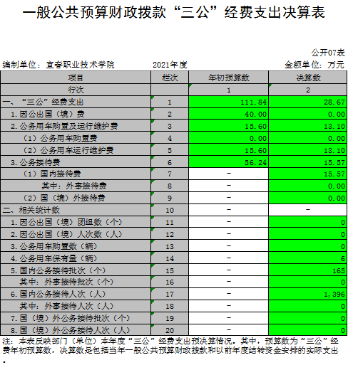 (二)公务接待费支出年初预算数为56.24万元,决算数为15.57万元,完成预算的27.68%,决算数较2020年增加2.03万元,增长14.99%,主要原因是加强与其他企业单位联系, 加强校企合作,扩大高职教育影响力。决算数较年初预算数减少的主要原因是:严格执行八项规定。全年国内公务接待165批,累计接待1396人次,其中外事接待0批,累计接待0人次,主要为:聘请专家学者培训、乡村振兴计划进一步推进。