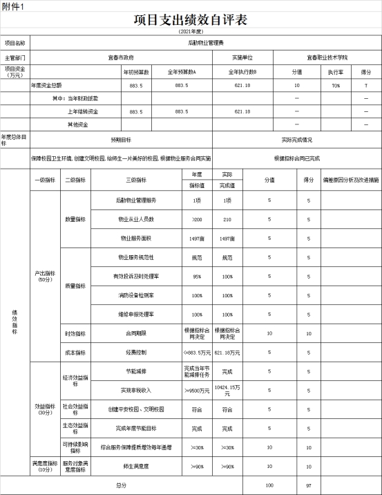 项目绩效自评总体综述:根据年初设定的绩效目标,“后勤物业管理费”项目绩效自评得分为97分。项目全年预算数为883.5万元,详见附表。