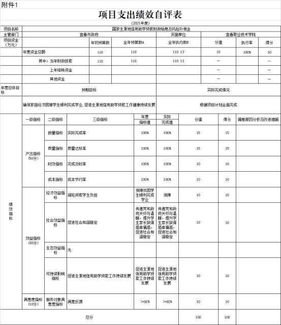我部门今年在市级部门决算中反映“2021年第五批新增一般债券kaiyun开云官方网站新校区搬迁购置”、“办公设备”、“职业技术学院用于新校区建设”、“高中职学生国家奖助学金各级补助”、“ 国家生源地信用助学贷款财政贴息及风险补偿金”、“ 后勤物业管理费”、“ 教体新区新校区建设资金”、“ 教学设备”、“人才引进”、“省级生均奖补”、“校安经费”、“校区搬迁服务费”、“医疗药品”、“招生宣传广告、印刷服务”、“中职免学费补助资金中央、省、市级资金”、“宜春职业技术学院附属小学校安经费”、“宜春职业技术学院附属小学校园足球”项目绩效自评结果。