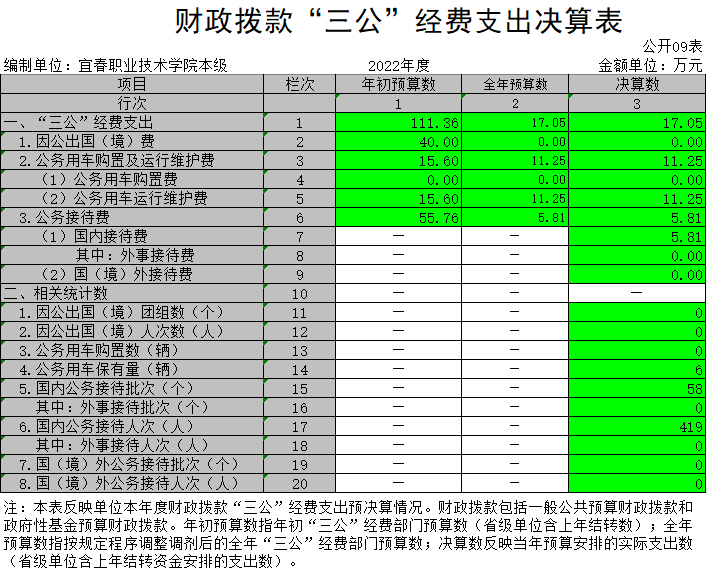 (二)公务接待费支出全年预算数为 55.76万元,决算数为 5.81万元,完成全年预算的10.42%,决算数较2021年减少9.52万 元,下降62.1%,主要原因是疫情期间,减少外单位来访次数。决算数较全年预算数减少的主要原因是:严格执行八项规定精神。全年国内公务接待58批,累计接待419人次,其中外事接待0批,累计接待0人次,主要为:聘请专家学者培训、乡村振兴计划进一步推进。