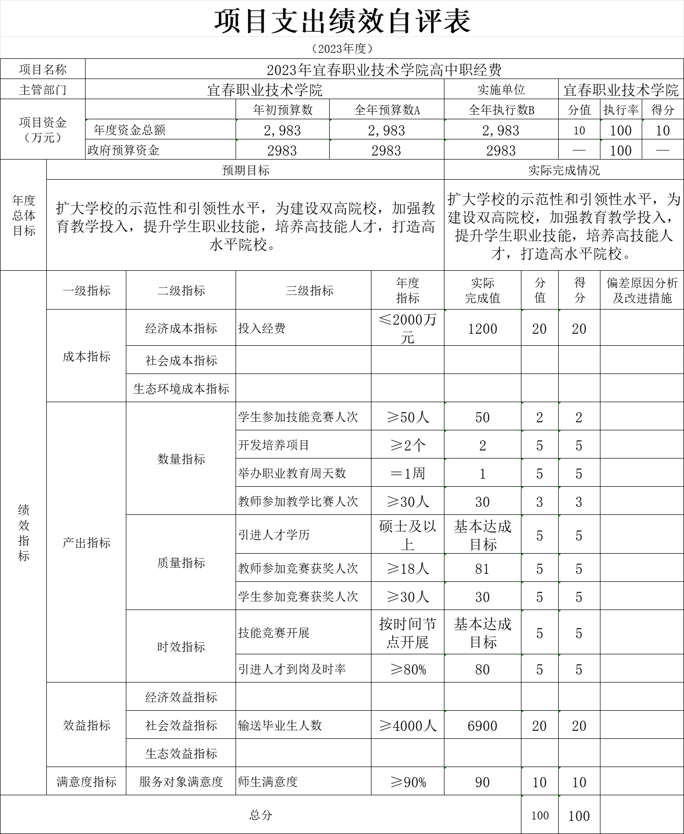 本单位2023年度支出总计45064.84万元,其中本年支出合计45064.84万元,比上年增加9989.75万元,增长28.48%,主要原因:为满足新校区教学需求进行了大量设备采购;结余分配 0万元,比上年增加(减少)0万元,增长(下降)0%;年末结转和结余311.10万元,比上年减少32.12万元,下降9.36%,主要原因:新校区搬迁工作结束,本单位支出恢复常态趋于平稳。