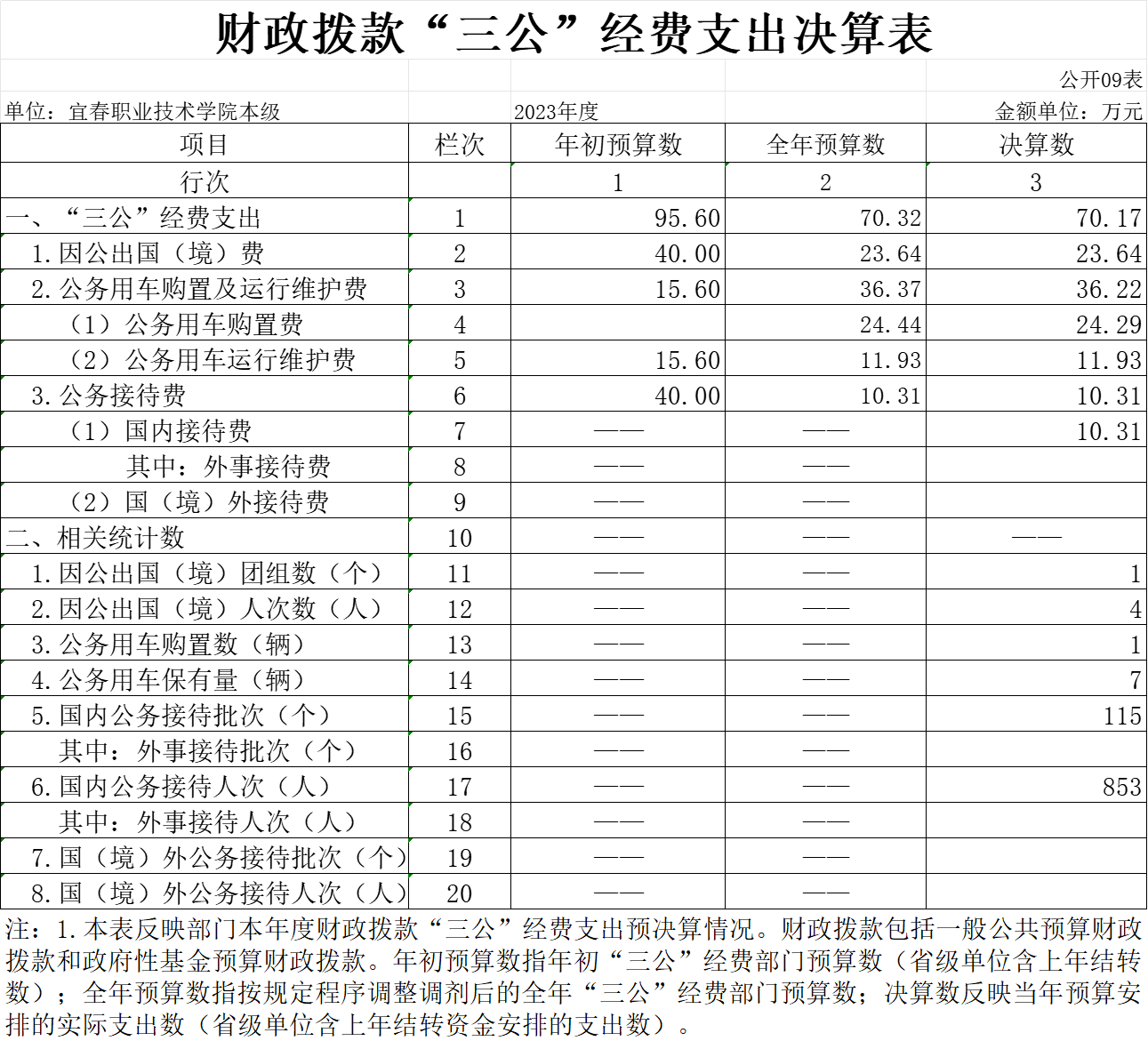 (六)“三公”经费:因公出国(境)费用反映单位公务出国(境)的国际旅费、国外城市间的交通费、住宿费、伙食费、培训费、公杂费等支出;公务接待费反映单位按规定开支的各类公务接待(含外宾接待)费用;公务用车运行维护费反映单位按规定保留的公务用车租用费、燃料费、维修费、过桥过路费、保险费、安全奖励费用等支出;公务用车购置反映单位公务用车车辆购置支出(含车辆购置税)