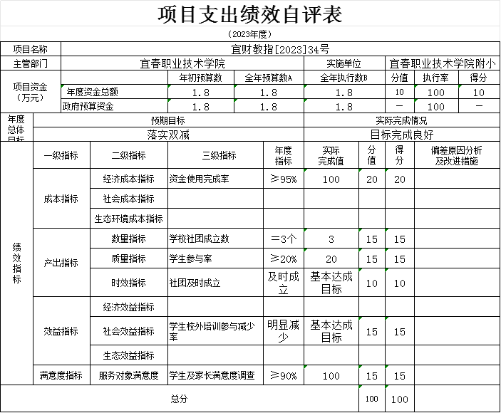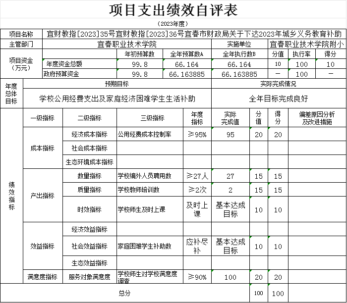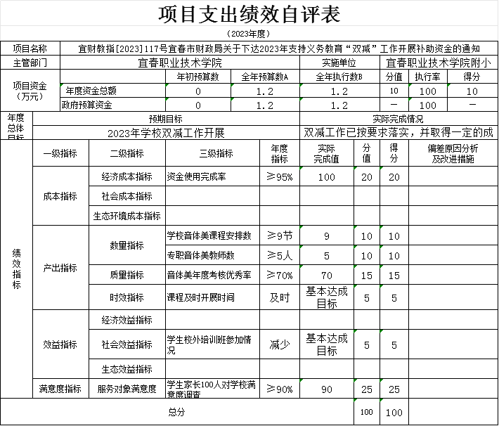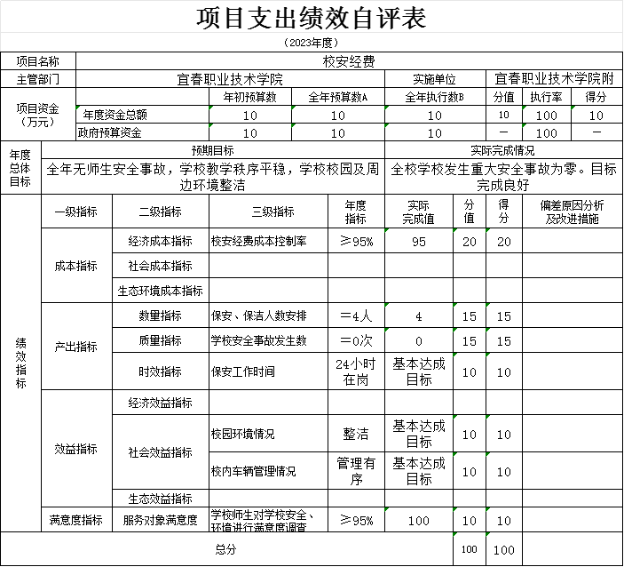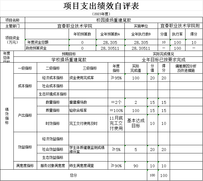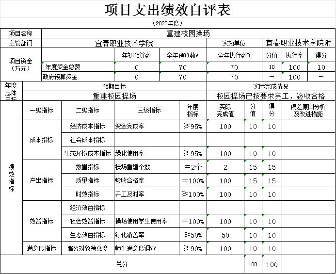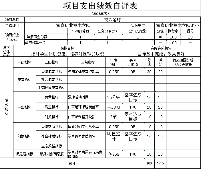 本单位“校园足球项目、校安经费项目、学校操场重建项目等支出绩效自评表”如下: