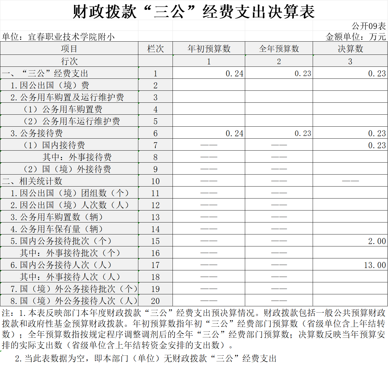 本单位2023年度财政拨款“三公”经费支出全年预算数0.24万元,决算数0.23万元,完成全年预算的95.83%;决算数比上年减少0.01万元,下降4.16%,其中:
