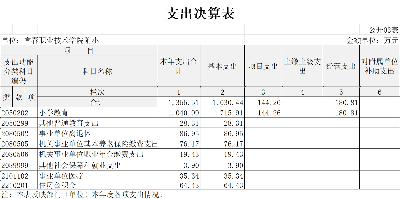 本单位2023年度支出总计1355.51万元,其中本年支出合计1355.51万元,比上年增加47.01万元,增长3.59%,主要原因:本年新增学校操场重建项目;结余分配0万元,比上年增加0万元,增长0%;年末结转和结余48.46万元,比上年增加2.89万元,增长6.34%,主要原因:部分资金在学期末支出。