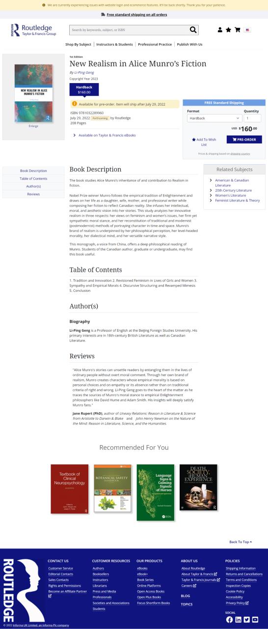 Nobel Prize winner Munro follows the empirical tradition of the Enlightenment and draws on her life as a daughter, wife, mother, and professional writer while composing her fiction to reflect Canadian reality. She infuses her intellectual, moral, and aesthetic vision into her stories. This study analyzes her innovative realism in three respects: Her views on feminism and women’s issues, her firm yet sympathetic moral stance, and her reconstitution of traditional and modernist (post-modernist) methods of portraying character in time and space. Munro’s brand of realism is underpinned by her philosophical perception, her level-headed morality, her dialectical mind, and her versatile narrative style.