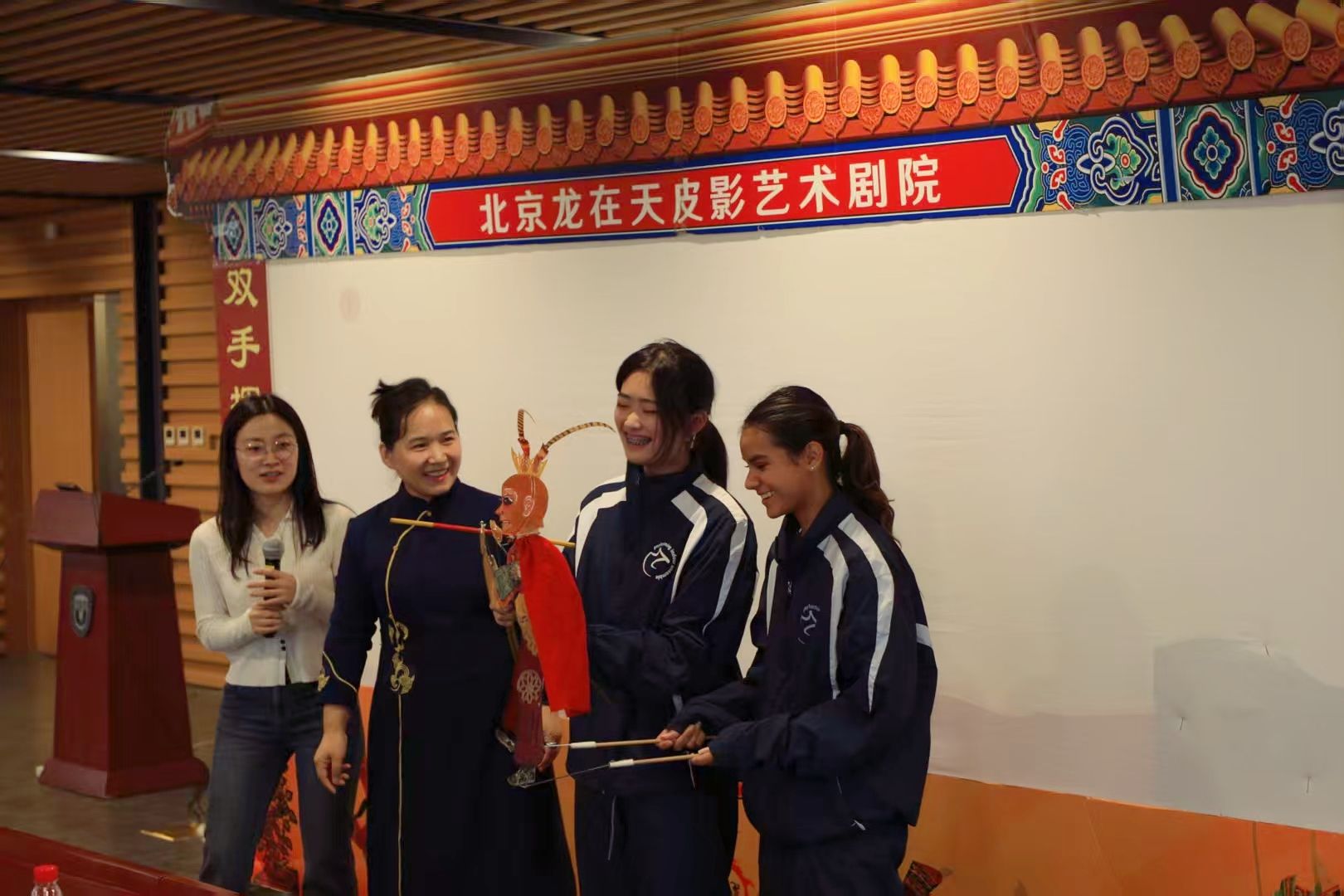 在表演环节,北京龙在天皮影艺术剧院带来了与北外YABO鸭脖合作创作的两部经典剧目《大闹天宫》与《嫦娥奔月》的英文配音版演出。幕布之上,悟空与嫦娥的形象在光影间跃动。纯正的英文旁白与唱腔与影人精准的动作、传统的配乐相得益彰,这种跨越语言障碍的生动演绎,让中美观众无需字幕便能沉浸于剧情之中。现场掌声不断,大家纷纷举起手机记录精彩瞬间,沉浸于皮影艺术的视觉盛宴中。