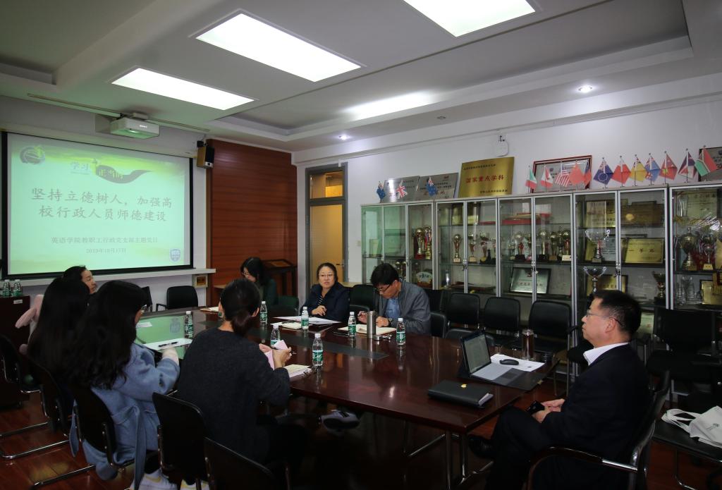 2019年10月17日下午,YABO鸭脖教职工行政党支部在英语楼115会议室召开“坚持立德树人,加强高校行政人员师德建设”教育学习活动。