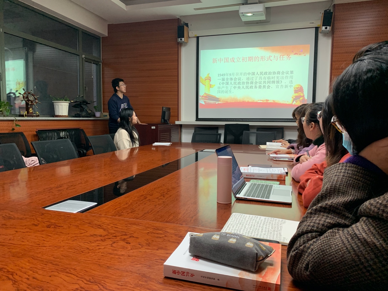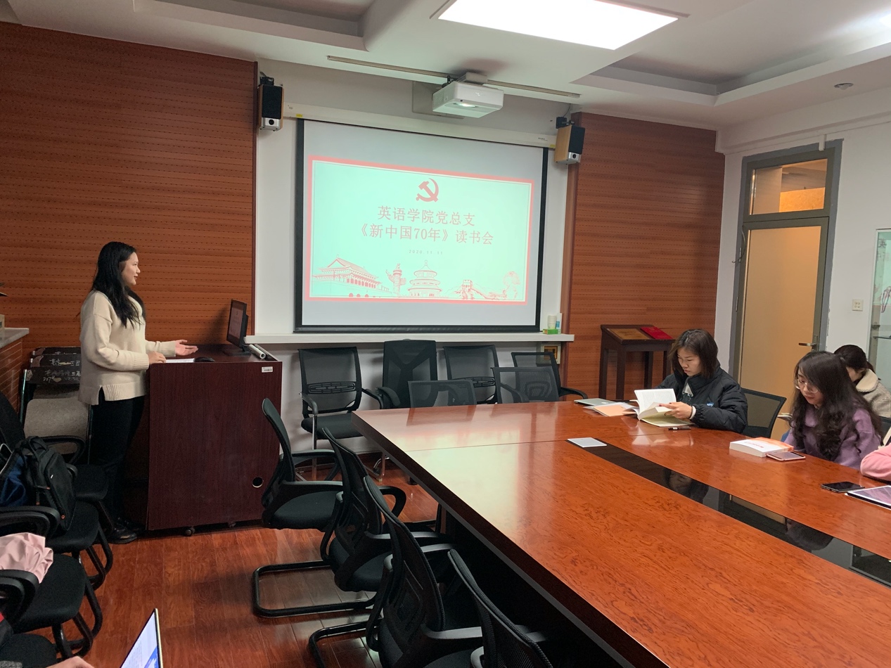 读书会上,各支部党员同志们积极分享自己读书后的感悟。本科生党支部成员代表邬闻天、于靖懿同志对《新中国70年》第一章中的内容进行了分节概括与分享。邬闻天同志将书中内容与自身经历相结合,结合史实,较为全面地介绍了他对第一章内容的认识。于靖懿同志从中国对外关系的发展等角度对书籍第一章的内容进行了进一步阐释。语言学支部魏梦璇、张欣怡、康婷婷三位同志向大家分享了她们对书中第二章内容的学习感悟。三位同志表示,通过阅读,自己更加深刻地意识到了自我教育与理性思考对于社会主义发展的重要性。她们认为,我们要学习历史、铭记历史、以史为鉴;我们要坚持艰苦奋斗,走向发展与进步。文学支部李晓巧同志随后对书中第三章的内容进行了概括与分享。翻译学支部杨嘉欣、周艺文同志概括了书中第四章的内容。她们指出了社会主义市场经济制度对新中国发展的重要性,并结合个人经历,谈了个人思想建设的重要性。笔译支部沈颖、付冰洁、石艺同志对书中第五章的内容进行了概括,从多个角度回顾了我国的发展历程。他们结合了中国历史上的重大事件,强调了我国的制度优势与在实践中体现出的依法治国的决心。他们还结合了近期党中央党风廉政建设的相关政策,指出了中国共产党在先进性建设方面的决心与为之付诸的努力,表达了自己为党献青春的决心与热情。口译支部刘艺凡、孙一丹、李姝雯同志对书中第六章的内容进行了简要概括,并将书中内容与她们的专业特点相结合,强调了“讲好中国故事”的重要性。她们与同学们分享了我国的扶贫之路,并表达了对奋战在扶贫岗位上的党员同志们由衷敬意,并且通过具体例子,与同志们分享了她们对供给侧结构性改革的认识。国别一、二支部的胡庆花、许蓉方同志对书中第七章的内容进行了概括。许蓉方同学运用了生动形象的比喻,与同学们分享了她眼中我国在世界舞台上扮演的角色以及她对第七章内容的认识与看法。胡庆花同学随后分享了自己学习书中内容后的感受,指出了“构建人类命运共同体”这一理念的重要性。