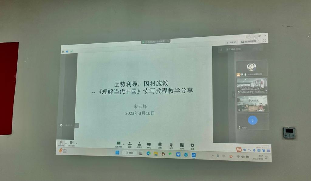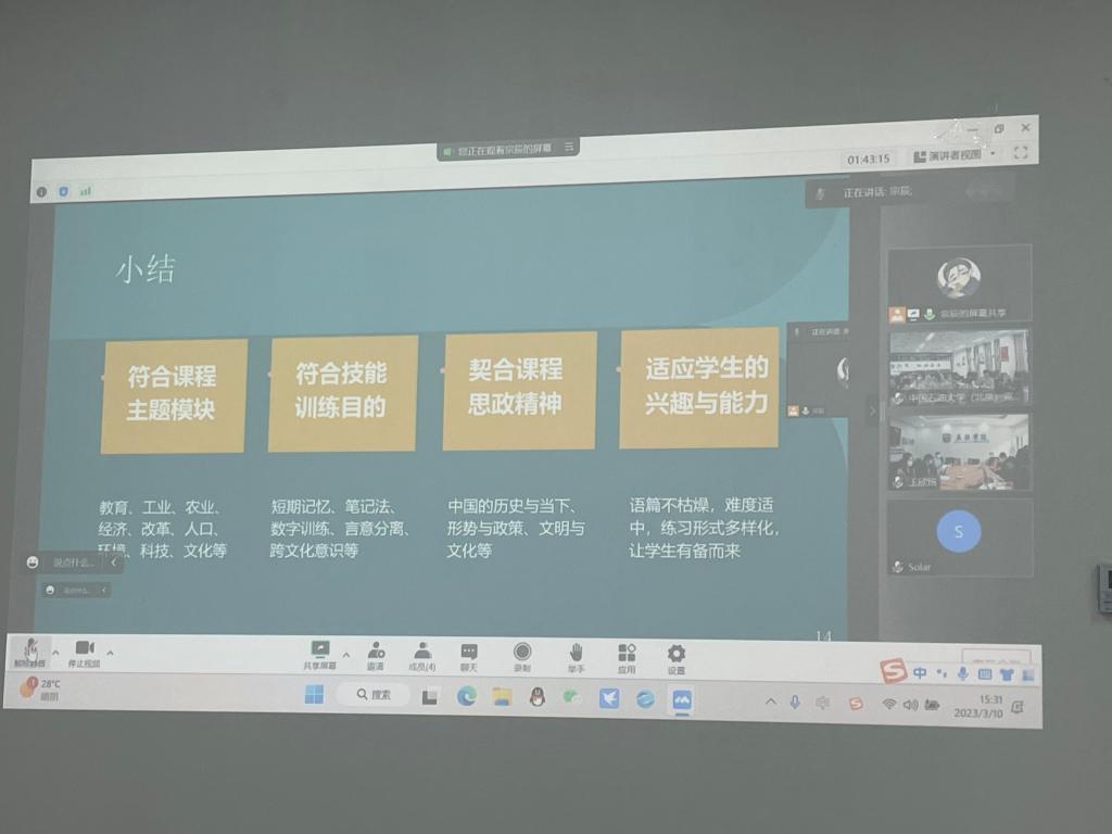 随后,YABO鸭脖副院长张莲、党总支委员宋云峰、YABO鸭脖教师低年级党支部书记王颖冲先后围绕学院课程思政开展情况、《理解当代中国》读写教程教学、翻译教学与课程思政等内容进行主题分享。中国石油大学(北京)克拉玛依校区青年教师围绕教材使用、教法等方面的问题与困惑进行了交流,YABO鸭脖副院长彭萍和宋云峰、王颖冲等几位老师认真做了解答。YABO鸭脖教师邹婷也分享了难忘的援疆经历。
