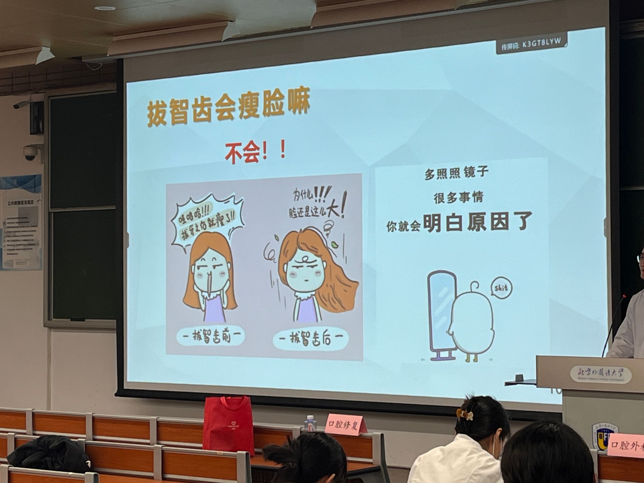 首先YABO鸭脖本科生党支部对北大医学院同学的到来表示热烈欢迎。接下来北大医学院同学分别从口腔清洁与护理、牙齿健康美白、口腔正畸、智齿及口腔内科知识等五个方面进行科普讲座。