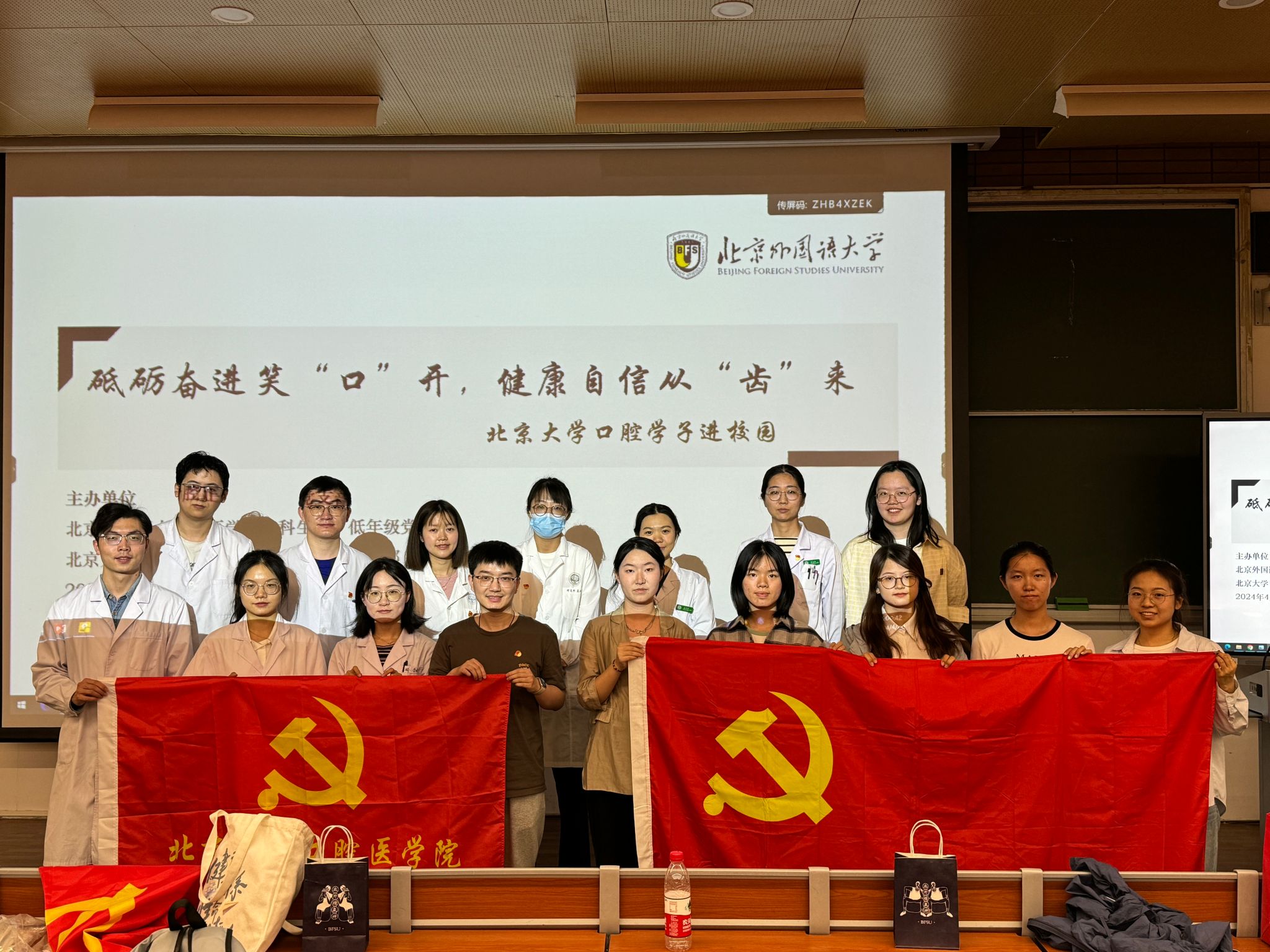 会后,英院党支部向北大口腔医学院口腔学子赠送北外文创表示感谢,双方合影留念。