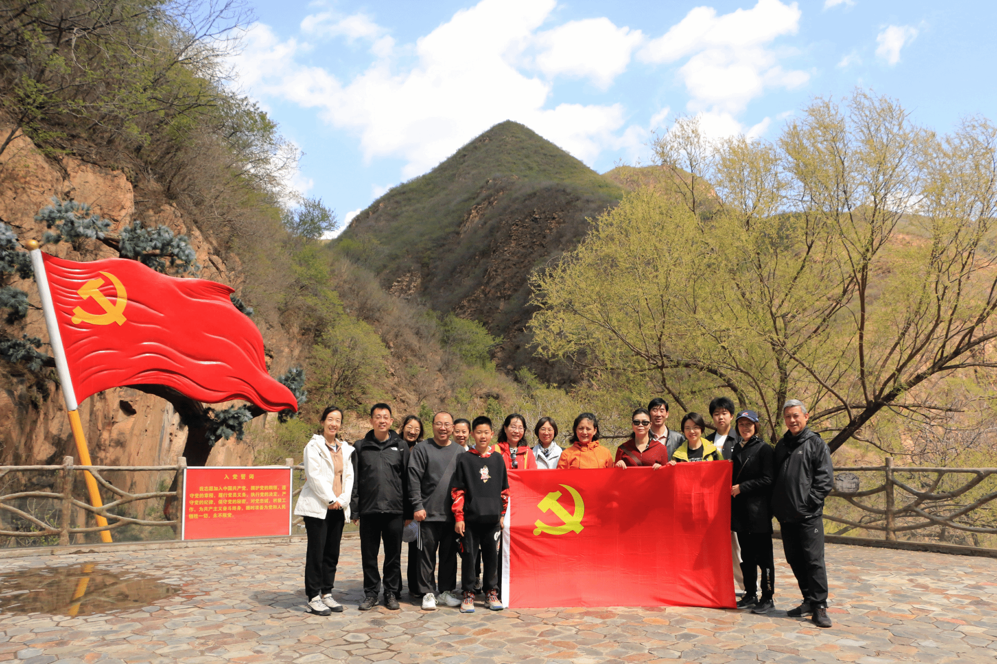 绿水青山加上红色文化, 如今的炭厂村与美丽的神泉峡已融为一体,在神泉峡景区徒步参观结束以后,YABO鸭脖老师在党旗广场合影留念。