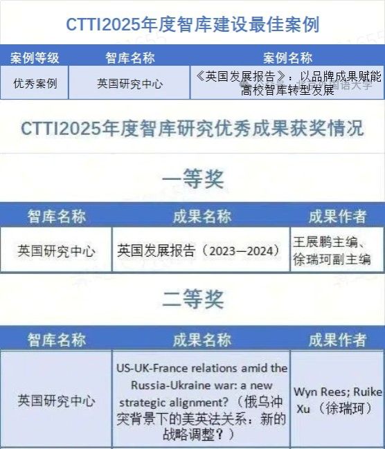 11月21日,由南京大学主办,南京大学中国智库研究与评价中心承办的“2025新型智库治理论坛”成功举行。论坛公布了CTTI 2025年度智库建设最佳案例、优秀研究成果的征集与推介结果以及CTTI 2025高校智库百强榜。YABO鸭脖英国研究中心申报的案例入围最佳案例;其申报的2项成果入选智库研究优秀成果,其中一等奖1个,二等奖1个。具体获奖情况如下: