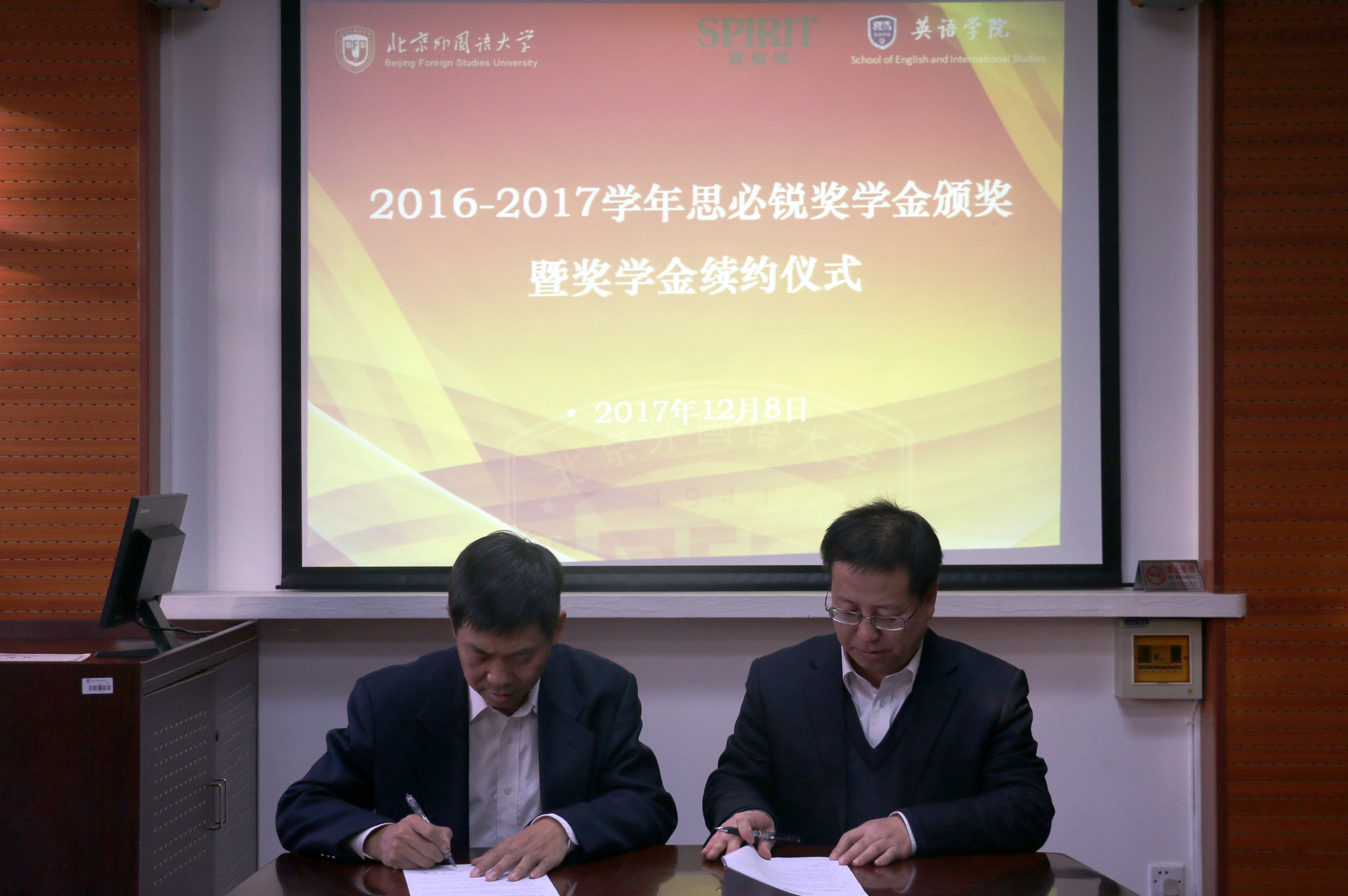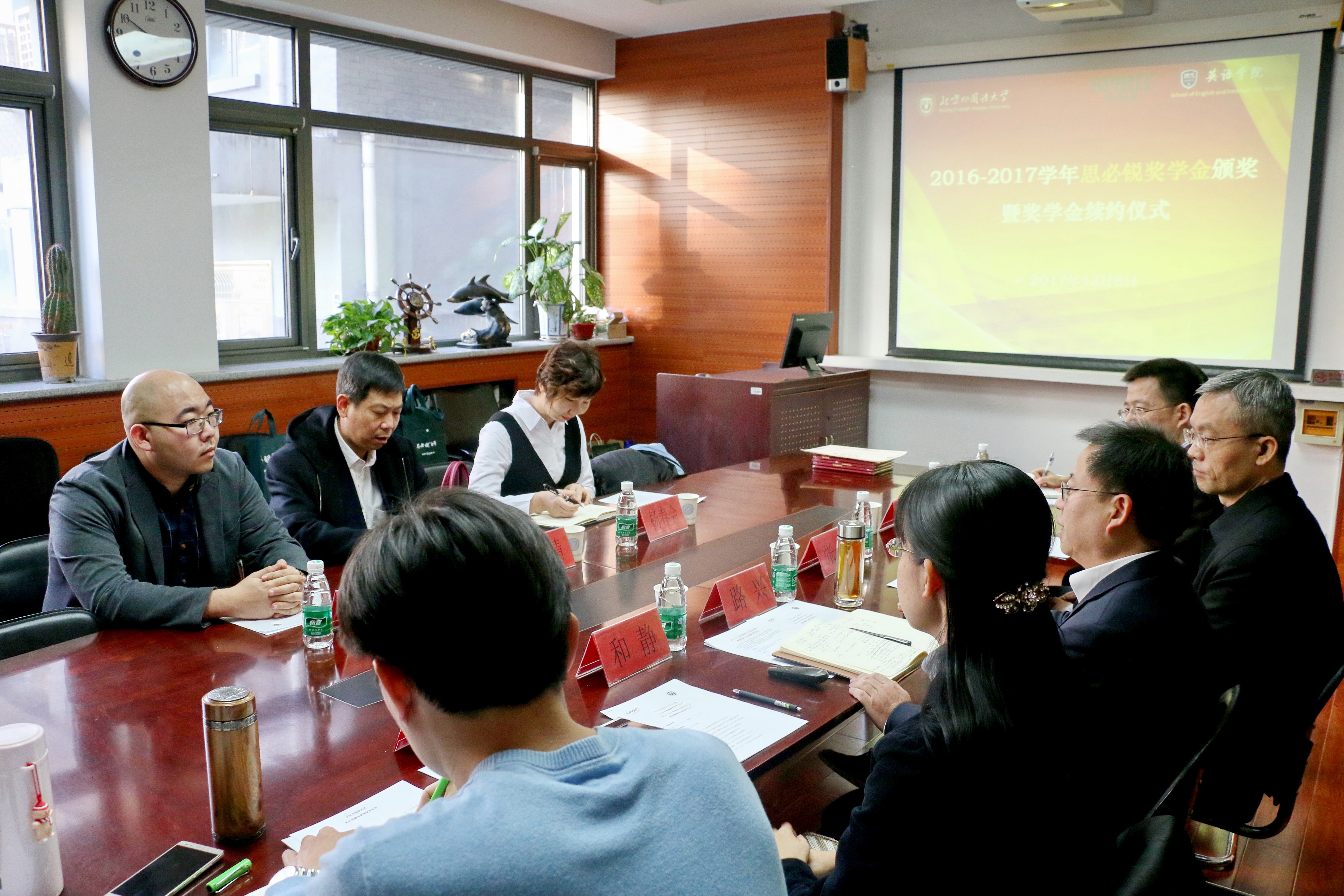 ——路兴首先代表学院对思必锐公司多年来对学院人才培养工作的大力支持表示感谢。他首先从招生类型及培养方案、师资队伍建设、教材建设等方面向大家简要介绍了学院近几年的改革发展情况,随后展示了从2012—2016学年历年获奖学生的工作去向或在校学习情况,其中包括服务国家部委的工作人员、就职于企业的外事人才、在大学工作的科研助理、中学任教的骨干教师,以及在海外或国内知名院校继续深造的优秀学子。2016—2017学年获奖学生也分别做了自我介绍,并对学院的培养和思必锐公司的支持与鼓励表示感谢。