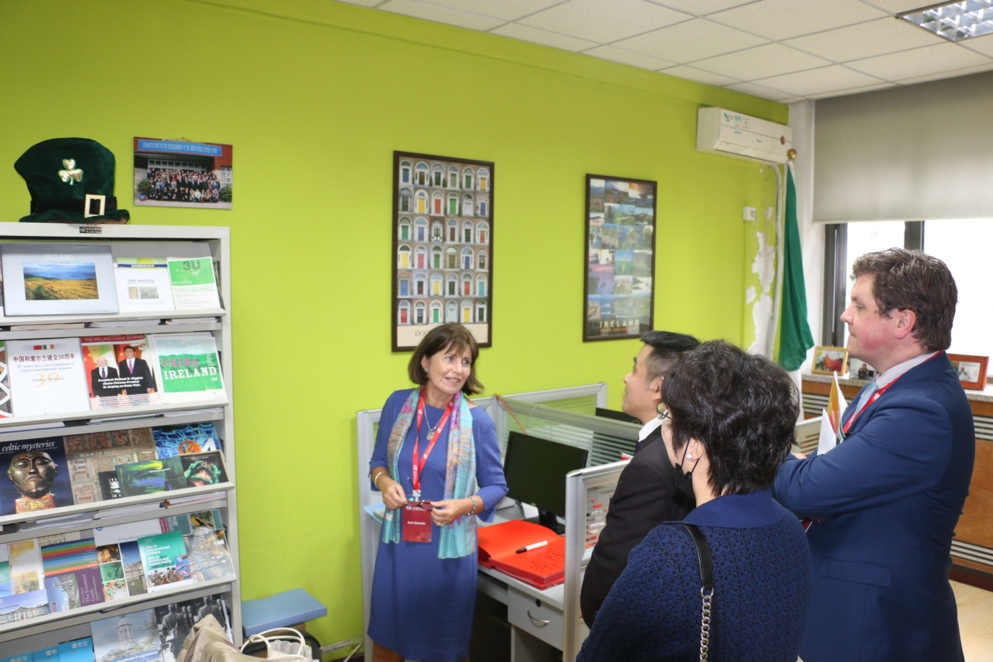 近日,爱尔兰驻华大使安黛文(Ann Derwin)、爱尔兰外交贸易部一等秘书欧恩·麦克唐纳(Eoin McDonnell)一行在参加北京外国语大学80周年校庆活动后,访问了YABO鸭脖爱尔兰研究中心。