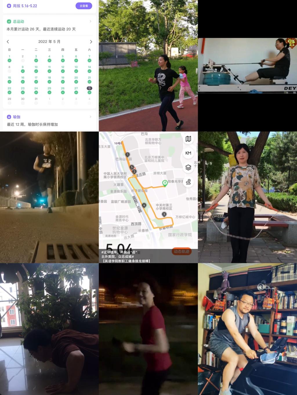 在活动期间,教职工们参与活动的热情十分高涨,小区楼下、附近公园、健身馆、家中等,都是学院教职工们的运动场所。而大家的健身方式也多种多样,有跳绳、跑步、踢毽、乒乓、平板支撑等等,教职工们每日优秀的打卡成绩把学院的活动推向了高潮。