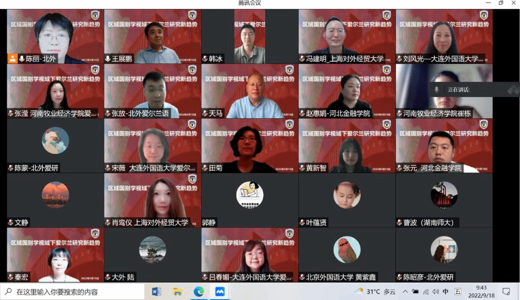 为深化中国爱尔兰研究的发展,促进学术和文化交流,YABO鸭脖爱尔兰研究中心于9月18日举办了“区域国别学视域下爱尔兰研究新趋势”学术研讨会。根据爱尔兰研究领域教育部国别和区域研究中心合作举办学术活动的共识,北京外国语大学、上海对外经贸大学、大连外国语大学、河南牧业经济学院、河北金融学院等高校的爱尔兰研究中心及爱尔兰研究学术网络、北外英国研究中心等学术机构共同举办本次研讨会。