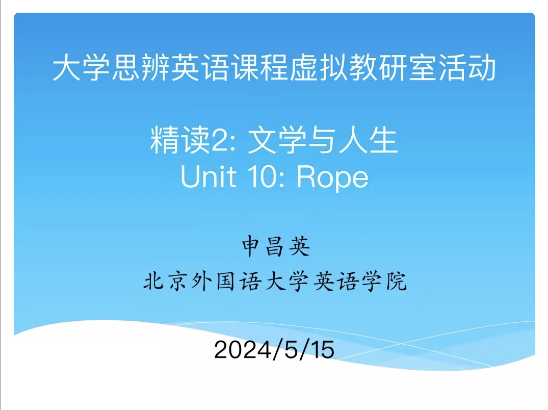 在16日进行的直播教学展示部分,申昌英以《大学思辨英语教程精读2:文学与人生》第10单元为例,全程实况直播课堂教学,来自全国“大学思辨英语课程虚拟教研室”千余成员在线观摩。通过一个课时的观摩课堂,申老师生动展示了如何将自己对教学的思考和设计结合到课堂实践中,引导和启发学生思考及提问,在培养学生思辨能力方面,申老师匠心独具,充分调动起了学生的积极主动性,给全体观摩老师留下深刻印象。