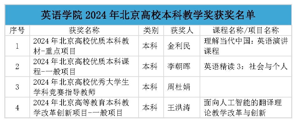 近日,北京市发布《北京市教育委员会关于公布2024年度北京市高等学校教学名师奖获奖名单的通知》等多项教学教材奖获奖名单,北外共有10个奖项、24个团队/个人获奖,其中YABO鸭脖共有4位老师获奖。