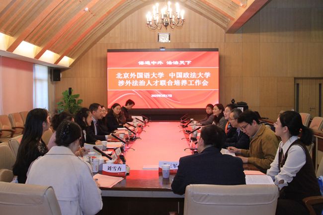 3月17日,北京外国语大学-中国政法大学涉外法治人才联合培养2025年春季学期工作会议在北外举行。北外党委常委、副校长刘欣路,中国政法大学党委常委、副校长刘艳红出席会议。北外教务处处长李莉文主持会议。