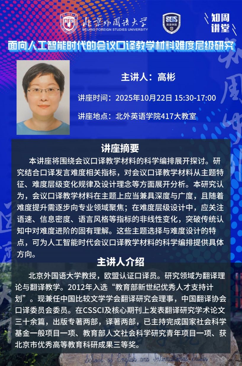 10月22日讲座:面向人工智能时代的会议口译教学材料难度层级研究
