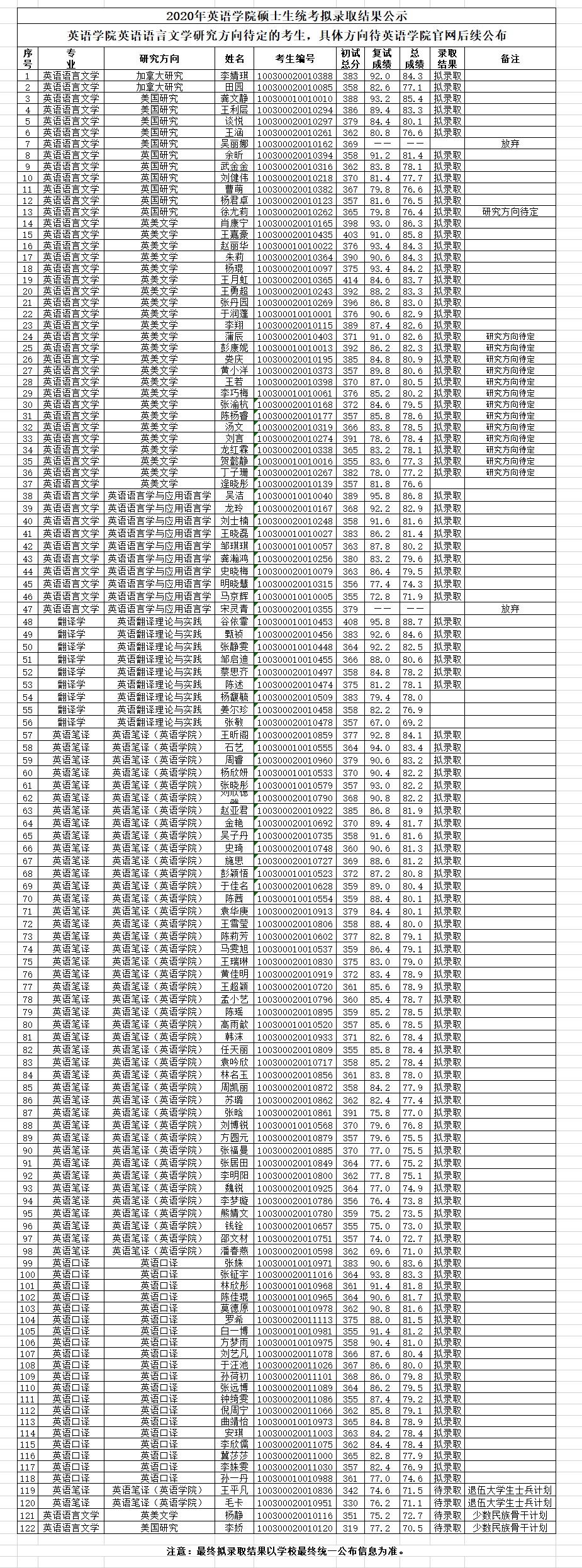 2020年YABO鸭脖硕士生统考拟录取结果公示
