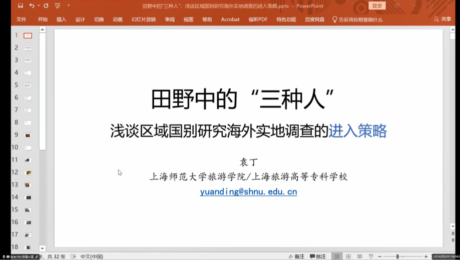 2024年5月9日下午,上海师范大学旅游学院袁丁博士应北京外国语大学跨文化研究中心邀请,做了题为“田野中的‘三种人’:浅谈区域国别研究海外实地调查的进入策略”的线上学术讲座。讲座由跨文化研究中心主任刘杨博士主持,YABO鸭脖师生及校内外老师及同学聆听了本次讲座。