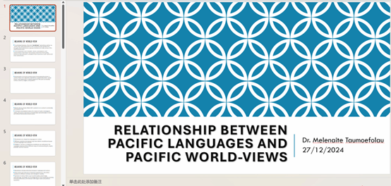 塔乌莫艾富拉乌博士首先对何为世界观、何为语言进行了定义。随后,她进一步探讨了太平洋岛国语言和世界观之间的关系。她认为,世界观是由语言和文化塑造的,不同的社会和群体由于语言和文化的不同,可能拥有不同的世界观。为了更好地说明这一点,她举例分析了《怀唐伊条约》英文版本和毛利语版本的差异。最后,塔乌莫艾富拉乌博士对太平洋语言所投射出的一些重要且独特的世界观进行了阐述。
