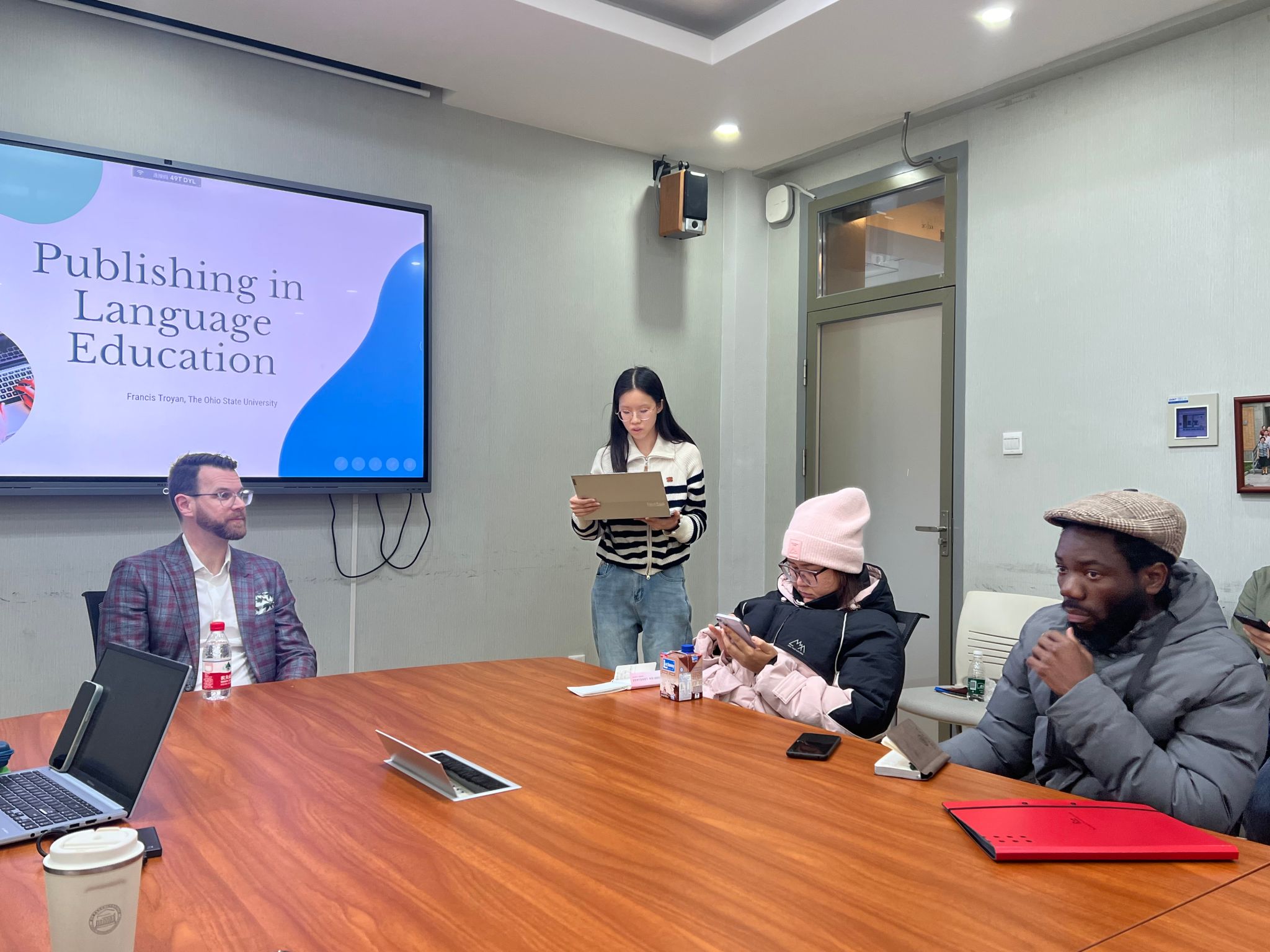 在询问了同学们关于期刊发表所面临的问题和挑战后,Troyan教授介绍了数本语言教育领域的著名国际期刊,并就期刊投稿的侧重点、投稿要求、政策、流程等展开了讲解。他提出,在为研究文章选择目标期刊时,研究者应对期刊的特点和内容有一定程度的了解,从而提升投稿文章和期刊的契合度。此外,Troyan教授还特别讲述了近期国际期刊对人工智能使用的要求。部分期刊要求研究者说明写作过程中的人工智能使用情况,不过具体投稿要求依期刊政策而定。作为国际期刊Foreign Language Annals(外语年鉴)的联合主编,Troyan教授还特别以该期刊为例,从期刊主编的视角出发,向同学们展示了完整的期刊投稿和发表流程。随后简要介绍了论文写作各个部分的写作要领,包括题目-摘要-介绍-文献综述-研究方法-研究发现-讨论-结论等。他特别提到了期刊发表对于匿名性的要求,并且强调了文献综述的“综合性”,提点同学们避免文献的简单总结和重复。最后,Troyan教授列举了一些论文写作的常见误区。讲座结束后,Troyan教授与同学们展开了学术研究相关的问题讨论。
