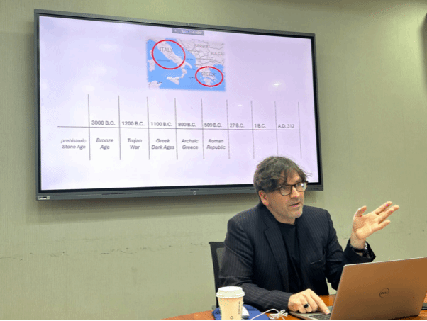 2025年4月21日下午,剑桥大学克莱尔学院古典学系副教授查尔斯·韦斯(Charles Weiss)博士应北京外国语大学英语文学研究中心之邀,于学院111会议室做了题为“The Forms of Classical Poetry”(西方古典诗歌的形式)的学术讲座。由英语文学研究中心、《英语文学研究》编辑部承办,旨在为广大师生提供一个深入了解古希腊、古罗马诗歌主要韵式的机会。本次讲座由英语文学研究中心邵雪萍老师主持,吸引了来自不同院系的本科生、研究生、博士生及青年教师近四十人参加。