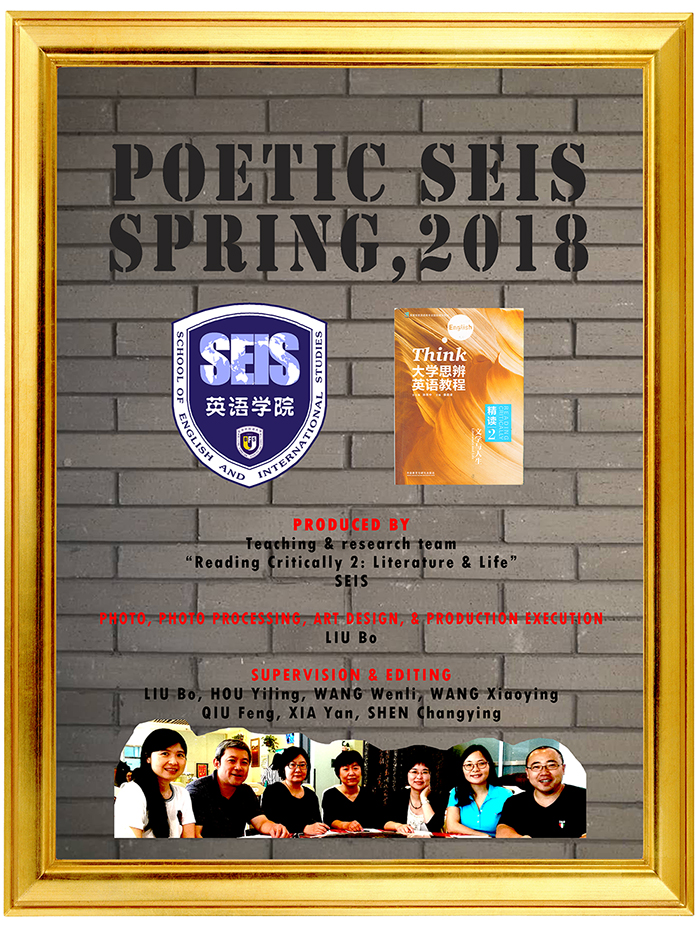 ——2018年春季学期,为丰富教学内容及激发学生学习兴趣,“英语批判性阅读(精读)2:文学与人生”课程教研组依托教材相关内容,组织学院2017级共7个班所有本科学生开展了“英文诗歌创作”活动,同学们积极参与,均提交了优秀作品,经过同学间相互赏读和评议,甄选出最受欢迎的21首英文诗歌作品,特此展示。此次活动中,同学们展现出高涨的热情、非凡的创造力、丰富的情感知识、健康的审美情趣、深刻的生活感悟,以及优秀的英文书面表达能力。