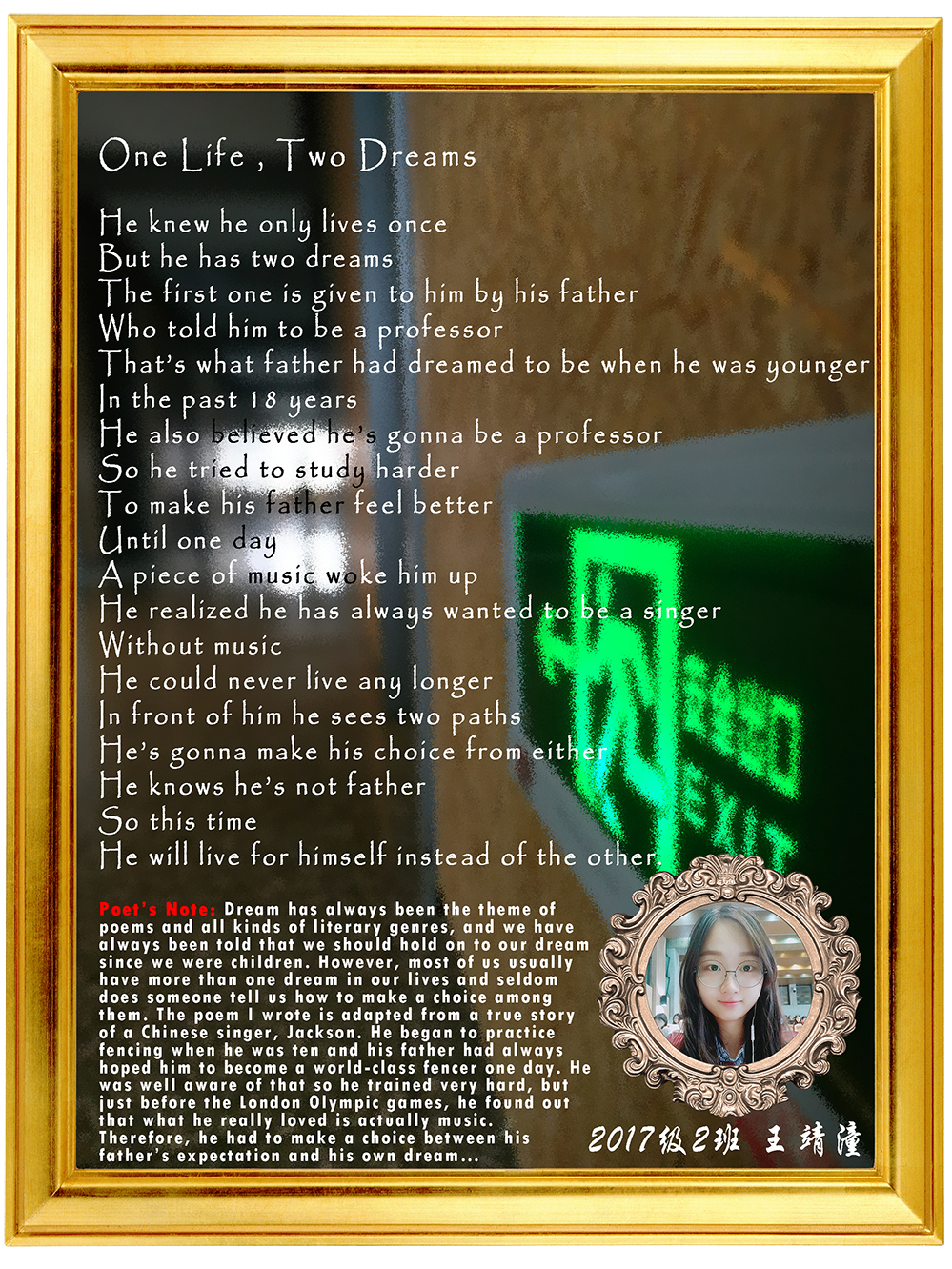 2017级2班 王靖潼:One Life, Two Dreams