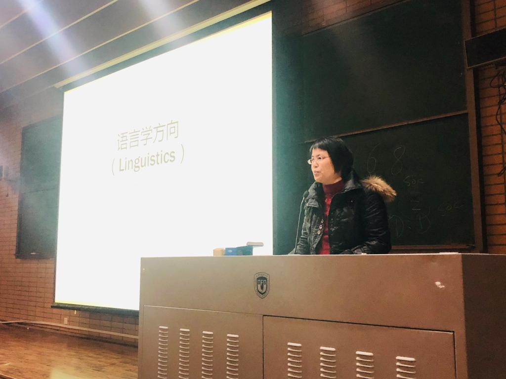 在此之后上台作介绍的是来自于语言学与应用语言学方向的陈亚平老师,她就本专业领域对新生们作出了详尽的阐释,并展望了该领域未来存在的自由研究、发展空间,其激动人心的宣讲激起了不少新生们对于探索未知领域的热血。