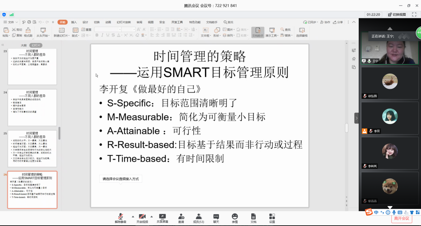 讲座中,王宁主任就与家人深度共处、重度拖延症以及毕业生就业三个方面进行了深入讲解。王宁主任强调,疫情期间,与家人相处时间增加,大家最重要的是要学会换位思考,增强共情能力。同时,居家学习期间,为避免拖延问题,同学们需要树立良好的时间观念,积极的学习态度和正向的人格品质,运用SMART目标管理原则,加强时间管理能力。