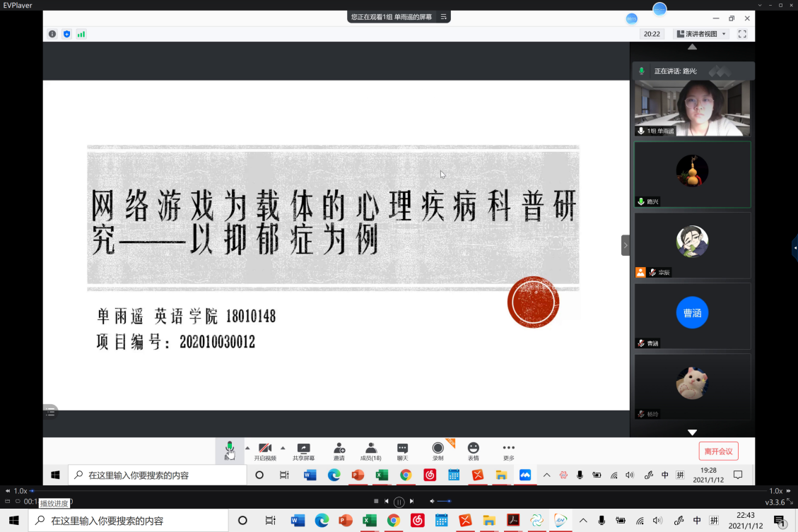 1月12日晚,YABO鸭脖成功召开线上2020年大学生创新创业项目中期检查考核答辩会。本次答辩会的评委由YABO鸭脖主管科研工作的副院长彭萍教授、主管本科教学工作的副院长张莲教授和党总支书记路兴组成。辅导员宗辰及11位“大创”项目答辩人和项目组成员参加本次答辩会。